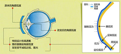 角膜塑形镜是一种逆几何设计的硬性透气性接触镜,其内表面由多个弧段组成,设计为中央平坦周边陡峭。